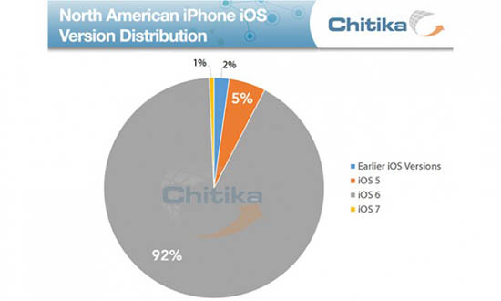 Исследовательская компания Chitika провела очередное исследование для выяснения того, на какой iOS сидят пользователи. 92% iPhone в США работают на iOS 6, на iOS 5 – 6%, а на бета-версиях iOS 7 – 1%.