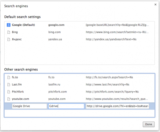 4.Вместо URL вводим следующий адрес: http://drive.google.com/?hl=en&tab=bo#search/%s. Если же вы делаете это для Gmail, то адрес будет таким: https://mail.google.com/mail/ca/u/0/#apps/%s.
