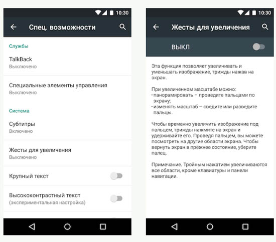 В настройках, в пункте «Специальные возможности», есть весьма интересная возможность в виде изменения масштаба. После активации соответствующего пункта («Жесты для увеличения»), при тройном тапе информация на дисплее может быть увеличена или уменьшена. Работает вне зависимости от того, в каком приложении вы находитесь.