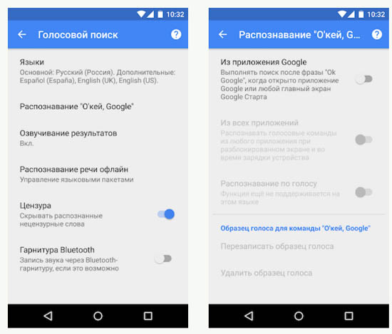 Чтобы активировать «O’кей, Google», перейдите в «Настройки Google», далее «Поиск и подсказки», затем «Голосовой поиск» и, наконец, «Распознавание «O’кей, Google». Не забудьте установить ползунок «Из всех приложений». Отметим также, что работа голосового поиска при выключенном экране работает только во время зарядки устройства.
