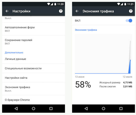 В стандартном для Lollipop браузере Google Chrome есть прекрасная фишка в виде экономии трафика, которая весьма удачно пригодится пользователям, которые не имеют в своем распоряжении безлимитный пакет интернета.