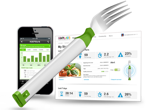 «Умная» вилка HAPIfork измеряет скорость и частоту движения столового прибора от тарелки ко рту. Если человек ест слишком торопливо, то вилка издает звуковой сигнал, предупреждающий, что следует снизить темп. Вилку можно подключить к компьютеру или мобильному устройству и, установив специальное приложение, посмотреть статистику данных. На основе частоты и скорости поедания пищи программа предложит пользователю индивидуальный план по снижению веса.