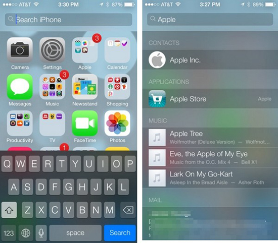 3. Spotlight не только обзавелся новым механизмом «умного поиска» но и переехал вверх экрана. Возможно, некоторые пользователи iOS 7 были слегка обескуражены, когда заметили, что правый свайп на первом экране приложений стал неактивным — поиск Spotlight теперь вызывается свайпом вниз с любого экрана.