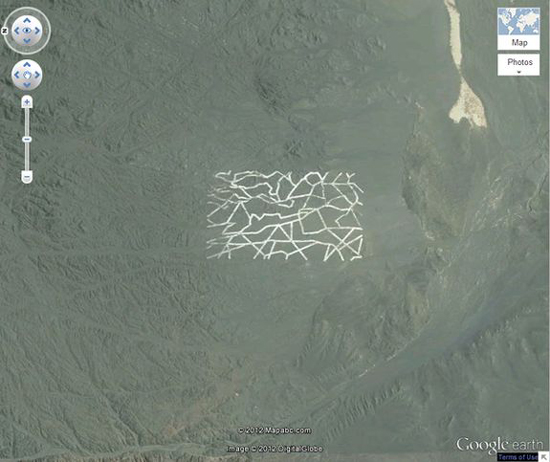 Эти загадочные структуры и ломаные линии были обнаружены при помощи Google Earth в пустыне Гоби (Китай). По мнению экспертов, это секретная военная база, а странные структуры, вероятнее всего, могли использоваться для испытаний оружия, калибровки спутников-шпионов и тестирования радаров.