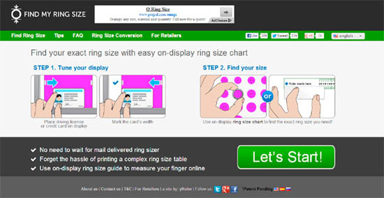 Зачастую покупать кольца онлайн — большая морока, особенно, если ты не знаешь, какого оно должно быть размера. Для тех, кто на Новый год собирался подарить коробку конфет, но осознал свою ошибку и теперь заранее готовится к 8 марта, команда сайта Find my ring size создала хороший инструмент. Суть процесса проста: вы прикладываете к экрану водительские права или кредитную карту. Так как параметры унифицированы, вы получите подходящую сетку размеров. Дальше — проще: просто прикладываете к экрану и выбираете необходимый размер. Российской метрики на сайте, к сожалению, нет, но Википедия в помощь.