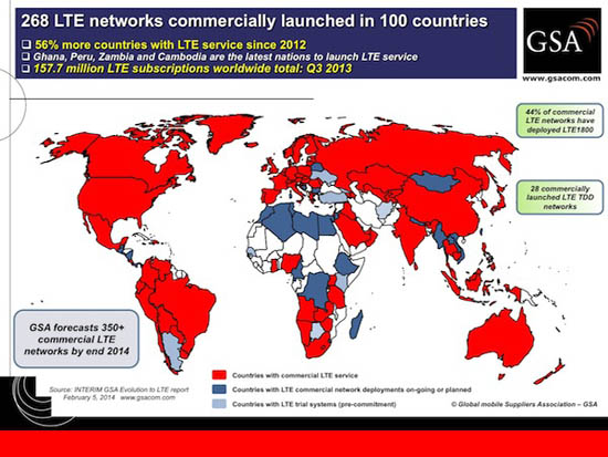 Согласно данным последних исследований с 2012 года произошёл рост развития LTE в странах по всему миру на 56%. В начале 2014 года к “LTE сообществу” присоединились даже такие страны, как Гана, Перу, Замбия и Камбоджа.