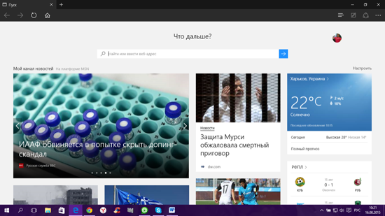 Новый браузер от Microsoft является основным отличием. Быстрый, современный, располагающий минималистским пользовательским интерфейсом. Как только создается новая веб-вкладка , пользователю демонстрируется поисковая строка, часто посещаемые веб-ресурсы, новостные, погодные, биржевые и спортивные виджеты, а также рекомендуемые приложения из магазина Windows Store. Вся информация динамична и релевантна прежним действиям. При наведении на заголовок вкладки демонстрируется мини-изображение содержимого открытой веб-страницы.