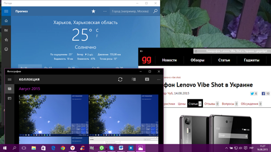 В Windows 8 я очень редко пользовался приложения в стиле Modern UI. Они разворачивались на весь экран, а закрыть их вообще было проблемой. Да и функциональность их была намного меньше. В Windows 10 эту проблему частично решили. Теперь приложения можно размещать на пол экрана, сворачивать и разворачивать, то есть как классические приложения. Это очень удобно. Функциональность , правда, еще осталась прежней.