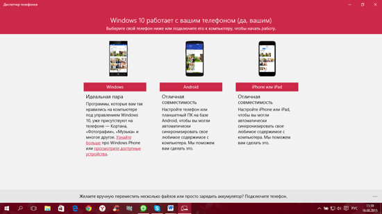 Появление в Windows 10 приложения «Диспетчер телефонов» больше всего обрадовало. Многие пользователи высказывали много критики в адрес Microsoft по поводу синхронизации ОС с телефонами и планшетами на IOS и Android.Свершилось. Нас услышали. Приложение очень хорошее и удобное.