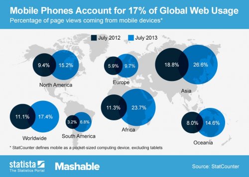 Как отмечает Mashable, ссылаясь на данные Statista, годом ранее мобильный трафик составлял примерно 11,1%, так что за прошедшие 12 месяцев данный показатель вырос на 6%. Наибольший прирост мобильного трафика наблюдается в странах Южной Америки, где он увеличился примерно вдвое. Наиболее распространен выход в интернет со смартфонов и планшетов в Азии и Африке, и это легко объясняется экономическими причинами (но и не только ими).