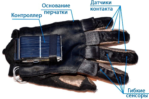 Эти перчатки оснащены датчиками, которые распознают язык жестов, переводят жесты в текст на смартфоне, который, в свою очередь, преобразует текст в произносимые слова. Концепция проекта состояла из одного датчика на каждой перчатке и мобильным устройством, которое ведет процесс распознавания.