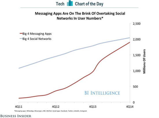 Венчурный финансист Фрэд Уилсон (Fred Wilson) убежден, что в 2014 году «завершилась социальная стадия Интернета». Конечно, социальными сетями пользуются и еще долго будут пользоваться, однако в ушедшем году произошла одна важная вещь: по количеству пользователей социальные сети почти сравнялись с программами для обмена сообщениями, они же мессенджеры.
