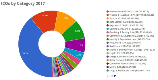 Инфраструктурные проекты, такие как Tezos и EOS, привлекли более 39% от общего фонда ICO, в то время как торговые и инвестиционные продукты, такие как децентрализованная обменная биржа AirSwap, составляют еще 14%.