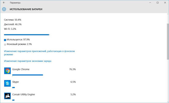 Под уровнем заряда аккумулятора, где отображаются и проценты, есть очень полезная вкладка, которая называется “Использование батареи”. Там отображается список программ, расходующих заряд. У меня на первом месте Google Chrome, который “берет на себя” больше 75 процентов, затем идет Skype – 6,5 процентов и Corsair Utility Engine – 5,2 процента. Вот как раз последняя программа мне не нужна, так как наушниками Corsair я уже не пользуюсь. Ее можно смело удалять. Так и в вашем случае: если в этом списке есть какое-то приложение, которое вам и даром не сдалось, то можете смело избавляться от него.