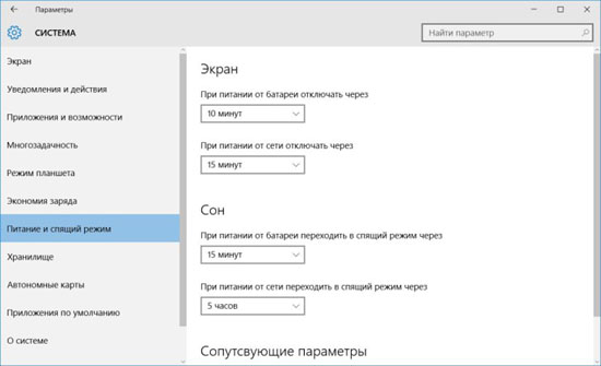В операционной системе Windows 10, как и в Windows 8.1, предусмотрены настройки питания и спящего режима. Думаю, вполне отличным вариантом будет задать отключение экрана через 10 минут при питании от батареи и через 15 минут при питании от сети. А вот что касается сна, то у меня он выключен вообще, но если вы хотите сделать все “по правилам”, то в первом окне лучше выставить минут 10-15, а во втором – часов пять.