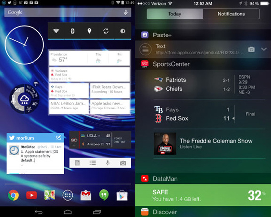 Хорошей новостью является то, что Apple, наконец, добавила виджеты в iOS 8. Плохая новость заключается в том, что они далеко не так полезны, как в Android. Дело в том, что Apple поместила всю информацию в Центр уведомлений, куда заглядывает далеко не каждый. В то время как виджеты в Android – интерактивные элементы интерфейса – могут быть расположены в любом месте на экране смартфона.