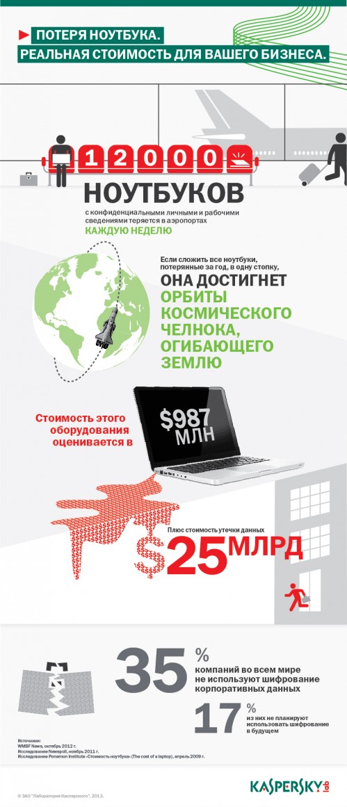 Более того, только в аэропортах США еженедельно теряется 12 тыс. ноутбуков, чья суммарная стоимость за год составляет в среднем $987 млн. Наконец, стоимость утечки корпоративных данных, предварительно оценивается в $25 млрд. убытков в год. Отметим, что это данные только для одной страны.