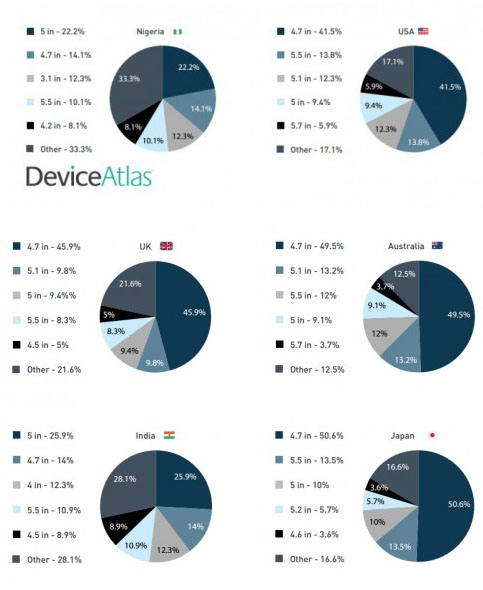 Ещё несколько лет назад смартфон с диагональю экрана более 4 дюймов считался огромным, но сегодня пользователи привыкли к мобильным устройствам с дисплеями 5,5 и более дюймов. Как отмечают эксперты аналитической компании DeviceAtlas, в последнее время популярность смартфонов с экранами более 5 дюймов стабильно растёт. Причём пользователи всё чаще отдают предпочтение именно "большим" девайсам. Тем не менее на сегодняшний день самой популярной диагональю экрана телефона является диагональ в 4,7 дюйма.