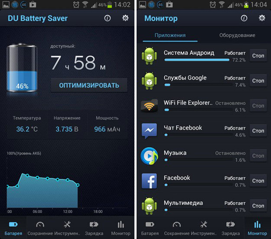 Приложение DU Battery Saver, позволяющее вести мониторинг расходования заряда батареи, продлит время работы смартфона. С этой программой не нужно беспокоиться о том, что заряд будет исчезать на глазах из-за потребления энергии приложениями, работающими в фоне, системными службами, беспроводными соединениями и всем, что может влиять на автономность девайса. Приложение позиционируется разработчиками как мощный инструмент, способный раз и навсегда избавить от проблемы с частой подзарядки устройства.