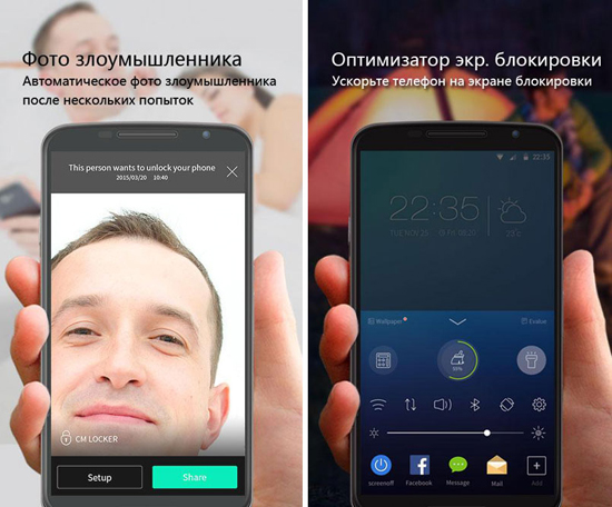 CM Locker – это интеллектуальный локскрин, который позволяет быстро получать доступ к часто используемым приложениям и запускать их с экрана блокировки. По умолчанию программа показывает информацию о погоде в верхней части главного экрана и значки для быстрого доступа к часто используемым приложениям внизу. CM Locker может самостоятельно подсказать, какие приложения запускаются чаще всего и позволяет настроить их вручную. Кроме этого, с целью защиты данных приложение автоматически сохраняет фотографию с фронтальной камеры при введении неправильного пароля и останавливает приложения, которые тратят заряд энергии.