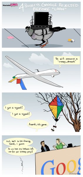 Цели благи, но ресурс Mashable не удержался и решил подойти к проекту с юмором, предложив комикс «4 идеи, которые отвергла Google до запуска WiFi-шаров». Советуем и Вам взглянуть не него.