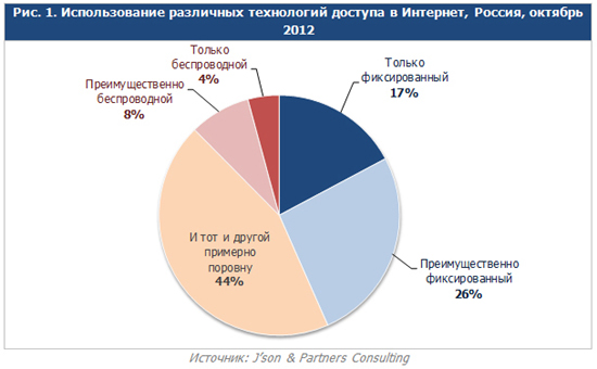 По данным компании, 43% российских интернет-пользователей пользуются исключительно или преимущественно фиксированным интернет-доступом, 12% — только или в-основном беспроводным, а еще 44% — и тем, и другим примерно поровну.