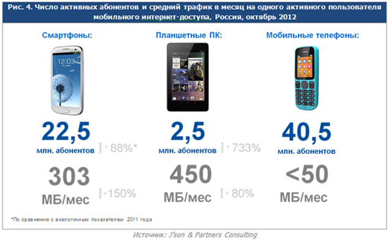Количество абонентов, использующих для выхода в интернет планшетный компьютер, пока сравнительно невелико — 2,5 млн человек — это составляет около 4% абонентов передачи данных с мобильных устройств или 71% всех пользователей планшетов. Зато на долю владельцев планшетов приходится наибольшее количество мобильного трафика.