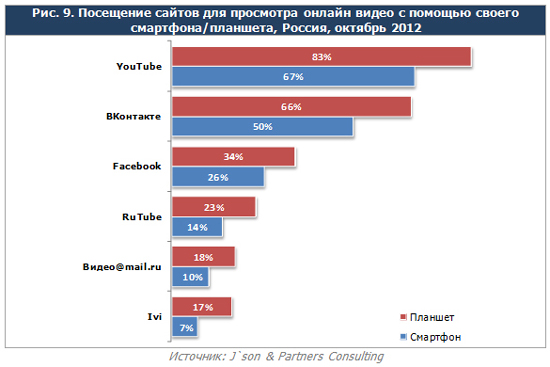 Интересно, что 41% пользователей мобильного интернета со смартфонов и 52% пользователей с планшетных компьютеров используют свое устройство для выхода в Сеть ежедневно. 47% и 45%, соответственно, выходят в интернет со своего устройства более трех раз в день. При этом владельцы планшетов чаще смотрят онлайн-видео, заходят в соцсети и пользуются поисковыми приложениями.
