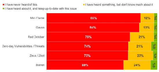 Пользователи во всех странах также демонстрируеют потрясающе низкий уровень компьютерной грамотности. Например, 69% потребителей никогда не слышали о ботнетах, а 73% ничего не знают о банковском трояне Zeus.