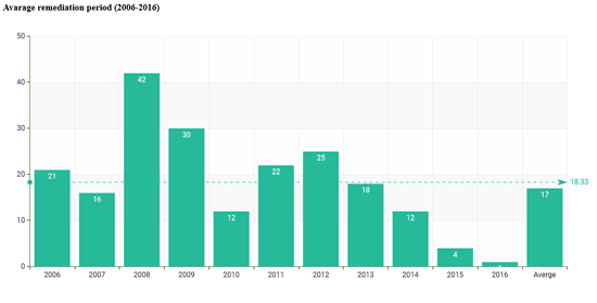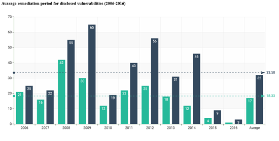 Из отчета следует, что производители стали уделять больше внимания активно эксплуатируемым уязвимостям. Среднее время между сообщением об уязвимости и выходом исправления безопасности сократилось с 25 дней в 2012 до 1 дня в 2016 году. Среднее время устранения уязвимости нулевого дня составило 17 дней. Это связано в основном с политикой раскрытия информации ИБ-компаний и производителей. За весь подотчетный период информация практически о половине уязвимостей (45,51%) была опубликована в день выхода патча.