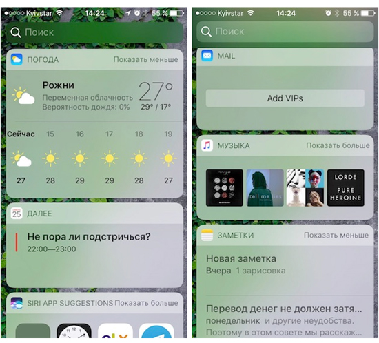 Наполнению экрана блокировки уделили особое внимание на WWDC 2016, поэтому я был уверен в его работоспособности. Естественно, речь о предустановленных виджетах, которых Apple поставила целую пачку. Они так и не получили поддержку фонового обновления данных, которая уже добралась даже до Apple Watch. Оставили без внимания и вопрос автоматической сортировки виджетов по активности, управлять ими можно лишь вручную из специального меню.