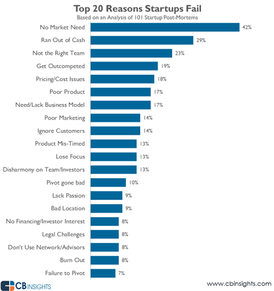 Глава венчурного фонда из Сан-Франциско Society3 и S3-Accelerator Алекс Шульц, работавший более чем с 100 стартапами и запустивший пять собственных проектов за последние пять лет, приводит следующие причины провалов: