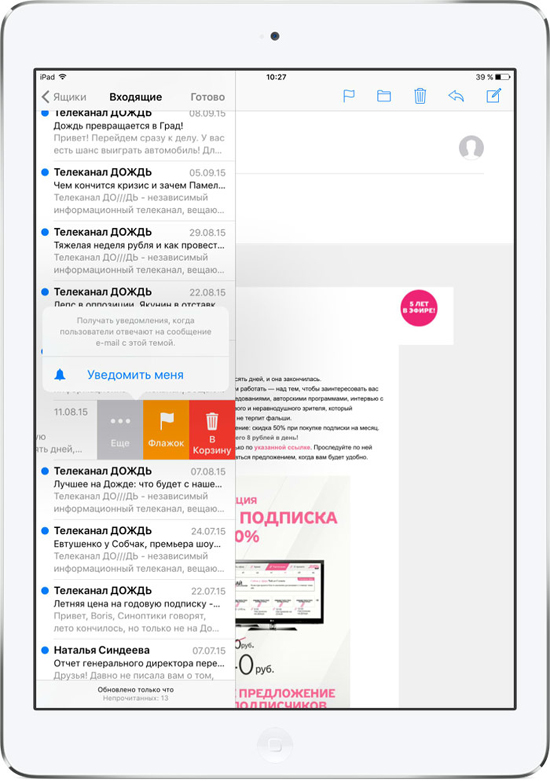 Если вы с нетерпением ждете ответа на важное сообщение по электронной почте, то можете настроить уведомления об этом в особом формате. Для этого вам потребуется открыть приложение «Почта», выбрать нужную цепочку сообщений и простым свайпом влево открыть контекстное меню. Затем, нажав на иконку «Еще», окрашенную в серый цвет, перед вами появится небольшое окошко с различными вариантами действий. Нас интересует только одно, которое называется «Уведомить…». Выбираем его и подтверждаем действие нажатием на появившуюся кнопку «Уведомить меня». Теперь вы точно не пропустите email от президента.