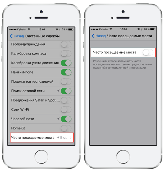 Нужный нам тумблер спрятан в недрах системных служб геолокации. Вот здесь: «Настройки» → «Конфиденциальность» → «Службы геолокации» → «Системные службы» → «Часто посещаемые места». Переводим его в положение «выкл.», и больше можно не бояться слежки спецслужб, Большого Брата и прочих масонов.