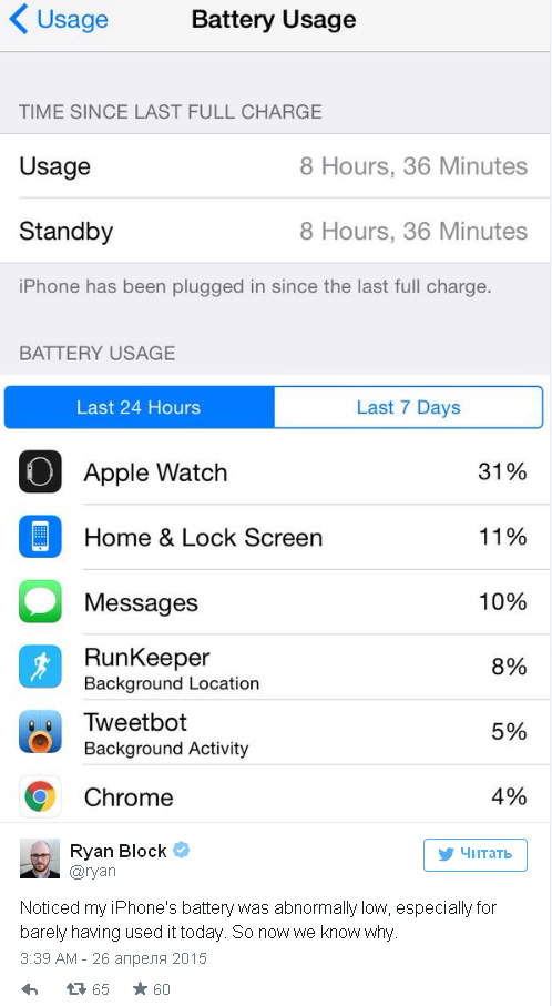 Другие владельцы часов отмечают значительное увеличение скорости разрядки iPhone. Среди таких пользователей и бывший редактор Engadget Райан Блок.