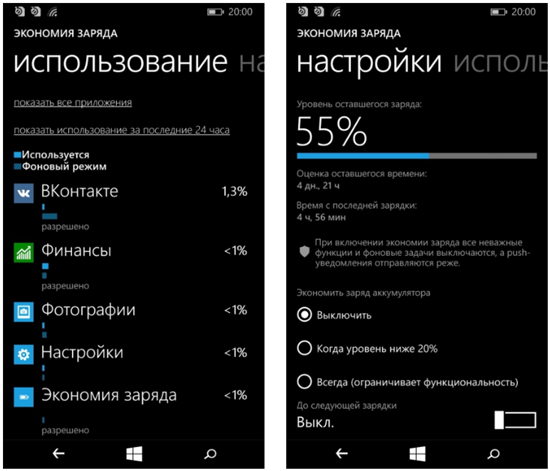 Скажу честно, я всю свою жизнь пользовался только Android-смартфонами, и за всё это время у меня в голове отложилась мысль, что телефон не может жить больше дня (то есть не больше 12 часов при активной нагрузке). Ситуация, которая сложилась с Windows Phone, просто разорвала мой шаблон! Lumia 1520 продержалась на одном заряде больше двух дней. Секрет может заключаться в ёмкости аккумулятора (3400 мАч), но на бюджетных моделях показатели автономности недалеко ушли от этого.