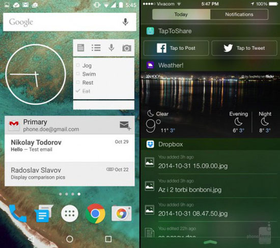 В Android не нужен свайп, а роль виджетов гораздо более существенная — и к этому необходимо привыкать. С одной стороны, если потратить время и разместить на основном экране часы (разумеется, с погодой), переключатель внешних модулей (Wi-Fi — в одно касание), мини-блокнот для заметок, главные клавиши плеера и блок с обновляемыми новостями, использовать смартфон будет невероятно удобно. С другой стороны, для такого количества виджетов необходим большой экран (как у фаблета — от 5,5 дюймов), поэтому «лишние» элементы все равно придется разместить на соседнем рабочем столе. Переход туда осуществляется при помощи свайпа, и преимущество перед iOS 8 автоматически исчезает.