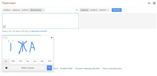 Оказались за компьютером без клавиатуры и надо срочно перевести текст? Ситуация не очень распространенная, но все же иногда случается. Для таких и других подобных случаев в сервисе Google Translate есть функция рукописного ввода прямо в окне браузера. Открываем для этого ярлык, который спрятан в небольшом контекстном меню окна перевода, выбираем соответствующий инструмент и пишем, что нам надо. Для перевода большого объема текста это не вариант (неудобно вводить данные), а вот слово или фразу распознать или перевести можно с легкостью.