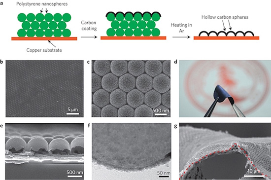 Проблемой цельно-литиевого анода является эффект деградации, из-за которого поверхность быстро покрывается наростами. Это и нецелевой расход материала, и препятствие на пути ионов, и риск потенциального короткого замыкания, если отросток дотянется до катода. Ячеистая структура из графита могла бы стать «смирительной рубашкой», задавив процесс появления выростов на корню, но как облачить в нее электрод из лития? Решение вопроса было найдено менее года назад учеными из Стенфордского университета, которые предложили покрывать поверхность металла слоем полистирольных шариков. Они самостоятельно сформируют подобие сот, на которое нужно осадить слой углерода толщиной всего 20 нм.