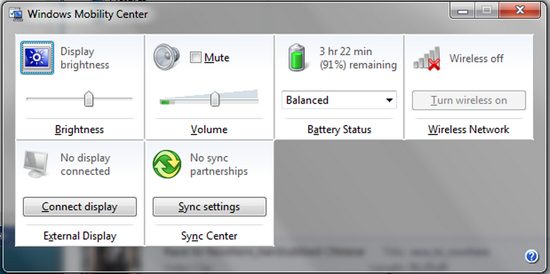 Очень мало пользователей Windows пользуются этим крайне полезным универсальным шорткатом. Он запускает Windows Mobility Center – контрольную панель, которая появляется только в Windows 7 (и Vista). Mobility Center позволяет управлять всем, что связано с мобильными компьютерами – профилем батареи, включением/выключением беспроводных соединений, яркостью дисплея, и громкостью звука. Если вы используете внешний дисплей или Windows Sync Center, элементы управления для этих систем также будут доступны через Mobility Center.