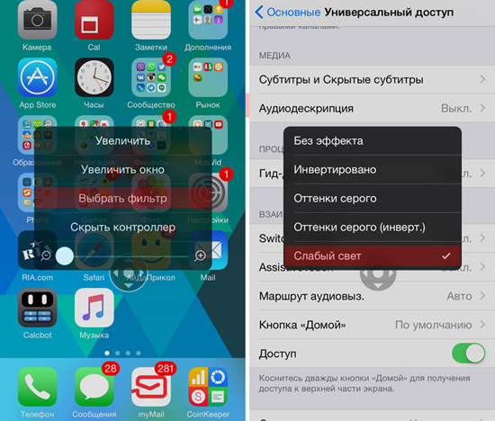 Настройки завершены. Экран стал значительно темнее, а привычная шкала яркости позволяет понижать уровень до минимальной отметки. Для выключения приглушенного света достаточно трижды нажать клавишу Home.