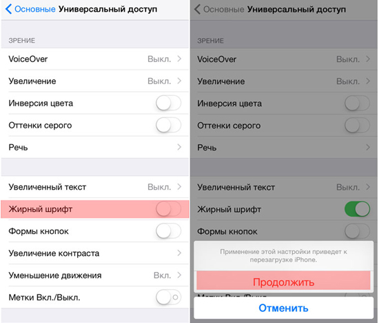 3. Всплывающие оповещение предупредит о необходимости перезагрузки смартфона для применения жирного шрифта. Согласитесь. iPhone будет перезагружен.