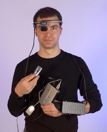Эту картину дополняла окутывающая человека паутина проводов. Разместить процессор непосредственно в очках в те годы было невозможно, поэтому сам системный блок, довольно крупный и тяжелый, приходилось носить с собой. Провода от него тянулись не только к глазу, но и к левой руке - на нее крепилась полноразмерная клавиатура. А еще в кармашке предлагалось носить небольшой пульт управления. Управлять компьютером можно было и при помощи голосовых команд, однако работала эта система из рук вон плохо.