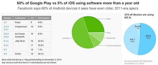 В Google 3 ноября текущего года отрапортовали о том, что 30,2% смартфонов и планшетов, работающих под контролем зеленого человечка, используют версию Android 4.4 KitKat. Условно говоря, она считается эквивалентом прошлогодней iOS 7, которая по состоянию на 27 октября все еще установлена на чуть меньше половины всех яблочных коммуникаторов – данные от самой Apple. В случае с купертиновскими устройствами разработчикам из Facebook приходится иметь дело с меньше чем полудюжиной конфигураций железа, адаптировать систему сравнительно просто. Иное дело Android-среда – ударный труд и неметафорические достижения программистов Google позволяют запускать новейшие версии ОС на старых маломощных аппаратных платформах. И это создает массу проблем при оценке их реальной производительности.