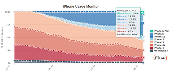 Эта компания отслеживает также популярность различных моделей аппаратов Apple. На 5 января на долю смартфона iPhone 4 приходилось 9,2% пользователей, так что каждый десятый не может установить iOS 8 даже при желании. Среди обладателей планшетов iPad у 3,4% есть модель первого поколения, также не поддерживающая iOS 8.