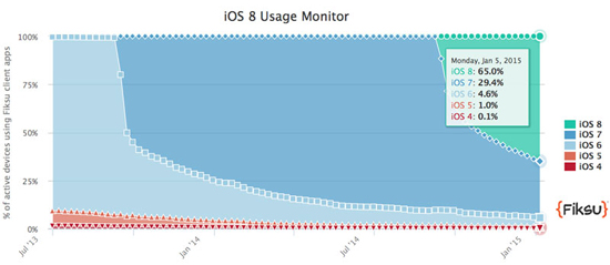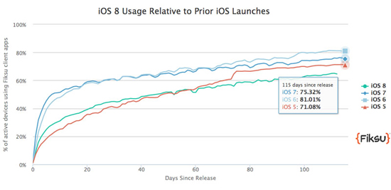 Статистика Fiksu (которая основана большей частью на Европе и США) даёт следующие результаты: 65% у iOS 8 против 75,32% у iOS 7 после такого же промежутка времени после релиза в прошлом году.