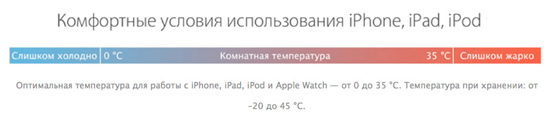 iPhone и iPad созданы для работы в большом диапазоне температур окружающей среды. Идеальная температура эксплуатации — от 16 до 22 °C. Очень важно: не используйте своё устройство при температуре выше 35 °C , так как это может необратимо снизить ёмкость батареи. В этом случае устройство не сможет работать от аккумулятора так же долго, как раньше.