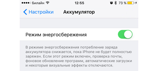 Впервые появившийся в iOS 9 режим энергосбережения — самый простой способ продлить работу iPhone, когда он начал разряжаться. Смартфон сообщает, когда уровень заряда аккумулятора опускается до 20%, а затем до 10%, и предлагает одним касанием переключиться в режим энергосбережения. Вы также можете включить его в разделе Настройки > Аккумулятор.