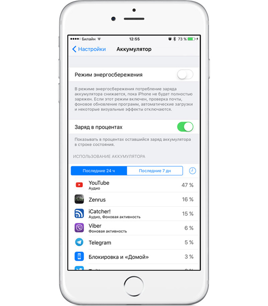 iOS 9 считается самой экономичной из всех версий iOS. Кроме того, она предоставляет специальные инструменты для управления аккумулятором: вы можете узнать, какой процент заряда аккумулятора используется каждым из запущенных приложений (если устройство не заряжается). Эти данные отображаются в разделе Настройки > Аккумулятор.