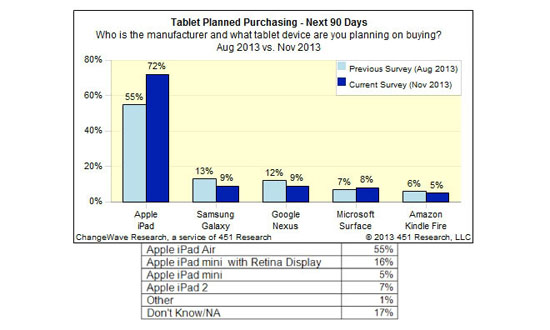 Исследовательское агентство Changewave опубликовало результаты своего опроса, проведенного в ноябре этого года. Согласно исследованию, большинство потребителей, которые планировали покупку планшета в ближайшие три месяца, склонялись к выбору одной из моделей iPad. В прошлом опросе, проведенном до выпуска новой линейки, только половина респондентов выбирали планшеты Apple.
